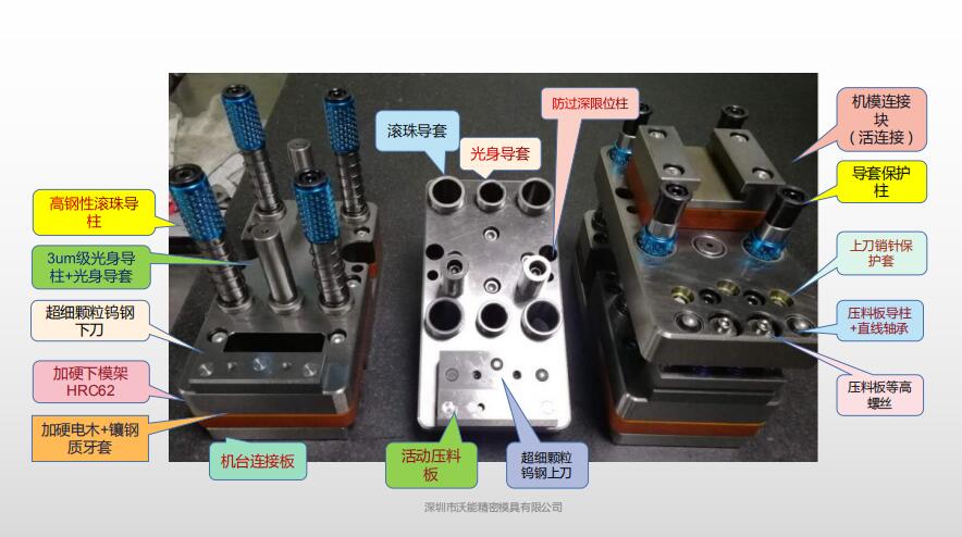 深圳市沃能精密模具有限公司超細顆粒鎢鋼 下刀 加硬下模架 HRC62 加硬電木+鑲鋼 質(zhì)牙套 活動壓料 板 超細顆粒 鎢鋼上刀 滾珠導套 深圳市沃能精密模具有限公司 機臺連接板 機模連接 塊 (活連接) 導套保護 柱 上刀銷針保 護套 壓料板導柱 +直線軸承 壓料板等高 螺絲